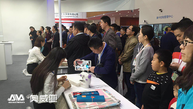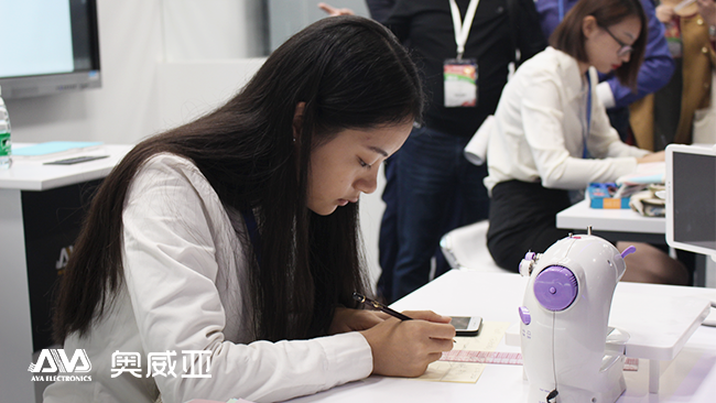智慧實訓空間是本次展會最火爆的奧威亞區(qū)域,圍觀人員絡繹不絕,大家都對“智慧實訓”這一新穎的教學形式產生了濃厚興趣。在智慧實訓空間里,有2名的學生坐縫紉機前,專注地進行著縫紉訓練。?