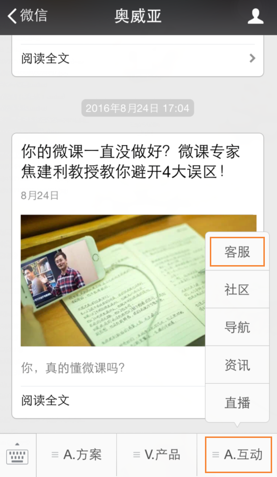 關(guān)注奧威亞的官方微信,點(diǎn)擊微信底部菜單【A.互動(dòng)】-V客服】即可體驗(yàn)。