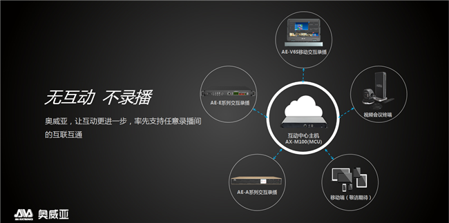 如今,奧威亞的任意系列錄播設(shè)備均可實(shí)現(xiàn)互動(dòng),同時(shí)我們只需添加奧威亞自主研發(fā)的MCU互動(dòng)中心主機(jī),即可實(shí)現(xiàn)第三方視頻會(huì)議終端、任意品牌錄播設(shè)備之間有效的互聯(lián)互通。真正打破了錄播互動(dòng)原有的技術(shù)界限!