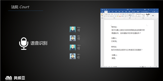 奧威亞智能語音庭審記錄運(yùn)用科技的力量,可以智能記錄庭審的語音全過程,庭審筆錄自動(dòng)生成,減輕書記員的工作壓力。讓庭審人員能夠更專注于庭審內(nèi)容,提高法院庭審質(zhì)效。