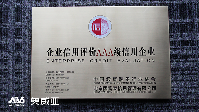 企業(yè)信用評(píng)價(jià),是指信用評(píng)級(jí)機(jī)構(gòu)在嚴(yán)密分析的基礎(chǔ)上,根據(jù)行政法規(guī)、企業(yè)經(jīng)營(yíng)情況、財(cái)務(wù)能力等因素進(jìn)行綜合考核,對(duì)企業(yè)信用程度進(jìn)行劃等級(jí)。信用等級(jí)普遍采用國(guó)際通行的"四等十級(jí)制",具體分為:AAA,AA,A,BBB,BB,B,CCC,CC,C,D。奧威亞經(jīng)過(guò)層層考核、評(píng)估,最終以良好的經(jīng)營(yíng)狀況和信譽(yù)度,榮獲教育裝備行業(yè)AAA級(jí)的企業(yè)信用證書。