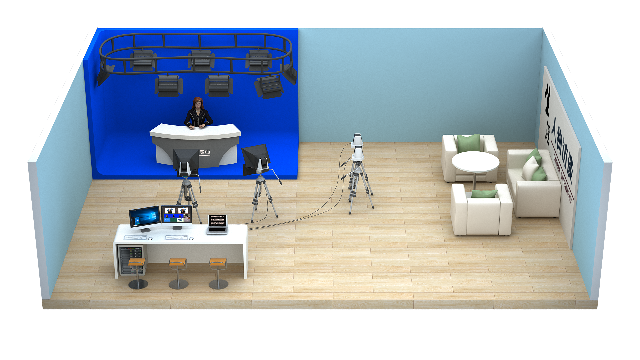 考慮到用戶的不同需求,我們設計了2種實現方式。當學校需要完成人物訪談、新聞發(fā)布、校長談話等實景拍攝的場景時,可以采用實景拍攝的方式。當想要完成譬如新聞播報、軍訓、校運會、校慶、電視比賽、名師大講堂等不同的場景時,學??梢圆捎锰摂M摳像的方式實現。